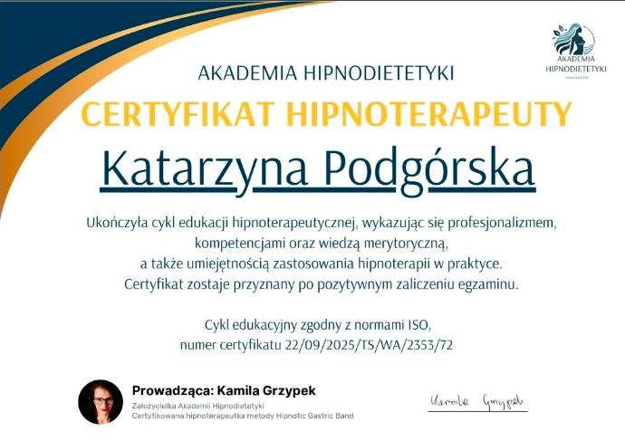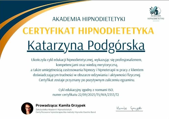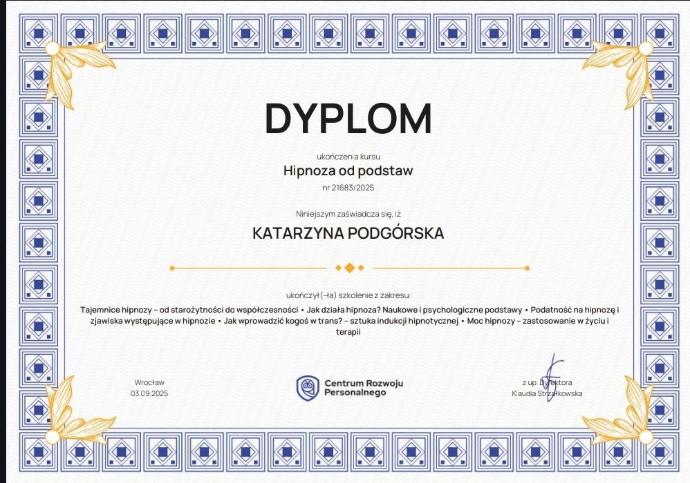 Ukończyłam Akademię Hipnodietetyki i uzyskałam certyfikację hipnoterapeutyczną. W swojej pracy łączę precyzję procesu z uważnością na człowieka – tak, aby dotrzeć nie tylko do objawów, ale do ich rzeczywistych przyczyn.
