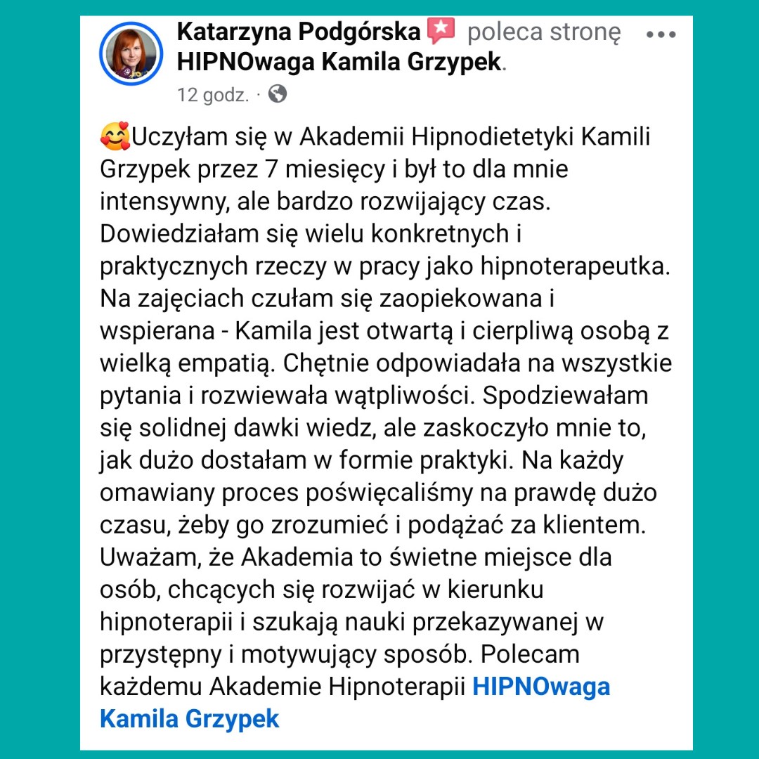Temat hipnozy zawsze mnie intrygował, zastanawiałem się, jak to jest, miałem kilka przekonań na ten temat, ale dopiero po przeczytaniu książki Michaela Newtona pt. "Wędrówka dusz", zdecydowałem, że zapiszę się na Hipnozę. Na Kamilę trafiłem przypadkiem (skomentowała post w grupie, którą obserwuje), postanowiłem do niej napisać i umówić się na sesje, cena w porównaniu z innymi tego typu usługami, była świetna. Kamila, od początku stworzyła przyjazną atmosferę, zachowując przy tym profesjonalizm. Sama sesja nie do końca spełniła moje oczekiwania (myślałem, że hipnoza wygląda inaczej), ale wyciągnąłem z niej bardzo ważne lekcje, których potrzebowałem. Nie zawsze będzie to miłe i przyjemne, czasami musimy zmierzyć się z czymś, czego się boimy, jednak warto podjąć walkę, a hipnoza, może nam w tym bardzo pomóc, gdyż kluczem jest zrozumienie. Kamile jak najbardziej polecam!!!