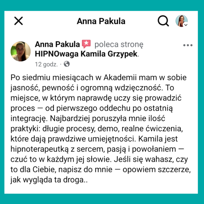 Dzięki Pani Kamili zaczynam inaczej patrzeć na siebie i swoje życie, za co