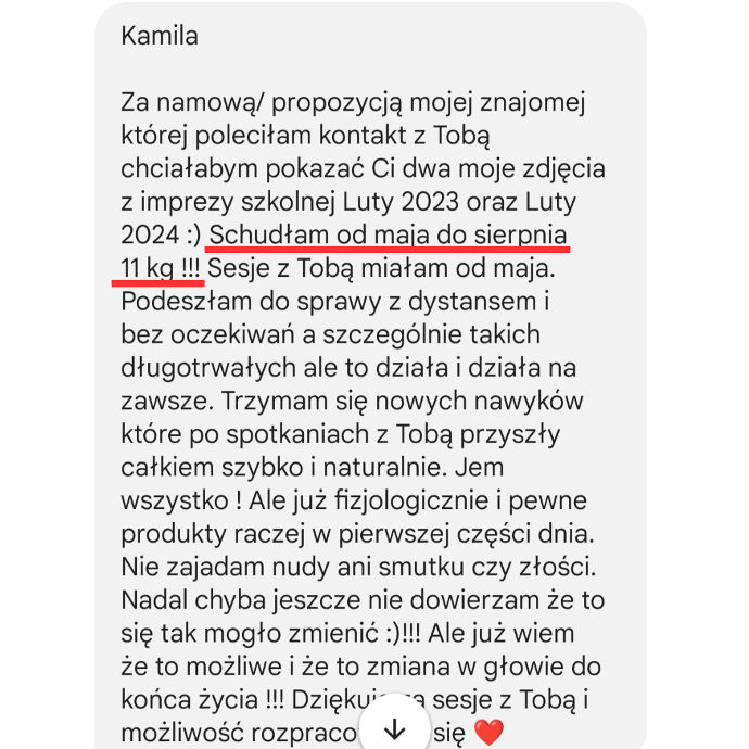Jeśli tylko znajdziesz kilanaście minut dziennie na ten program to z pewnością dojdziesz do jedzenia fizjologicznego, uwolnisz swoją głowę od nieustannych myśli o tym co i kiedy zjeść, pokochasz siebie i swoje ciało.
