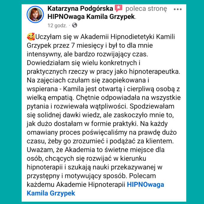 To jest wspólna baza – fundament, który sprawia, że absolwenci Akademii Hipnodietetyki mają takie same kwalifikacje hipnoterapeutyczne jak wiele innych osób na rynku.