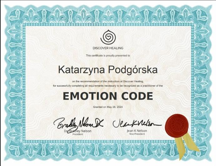 Pracuję również jako certyfikowany praktyk Kodu Emocji, wspierając uwalnianie zapisanych w ciele napięć i doświadczeń, które często – pozostając poza świadomością – wpływają na decyzje, relacje i sposób odczuwania siebie.