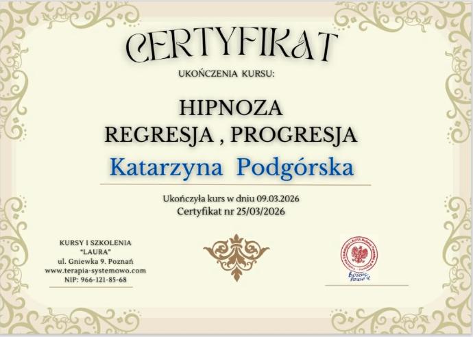 Ukończyłam Akademię Hipnodietetyki i uzyskałam certyfikację hipnoterapeutyczną. W swojej pracy łączę precyzję procesu z uważnością na człowieka – tak, aby dotrzeć nie tylko do objawów, ale do ich rzeczywistych przyczyn.