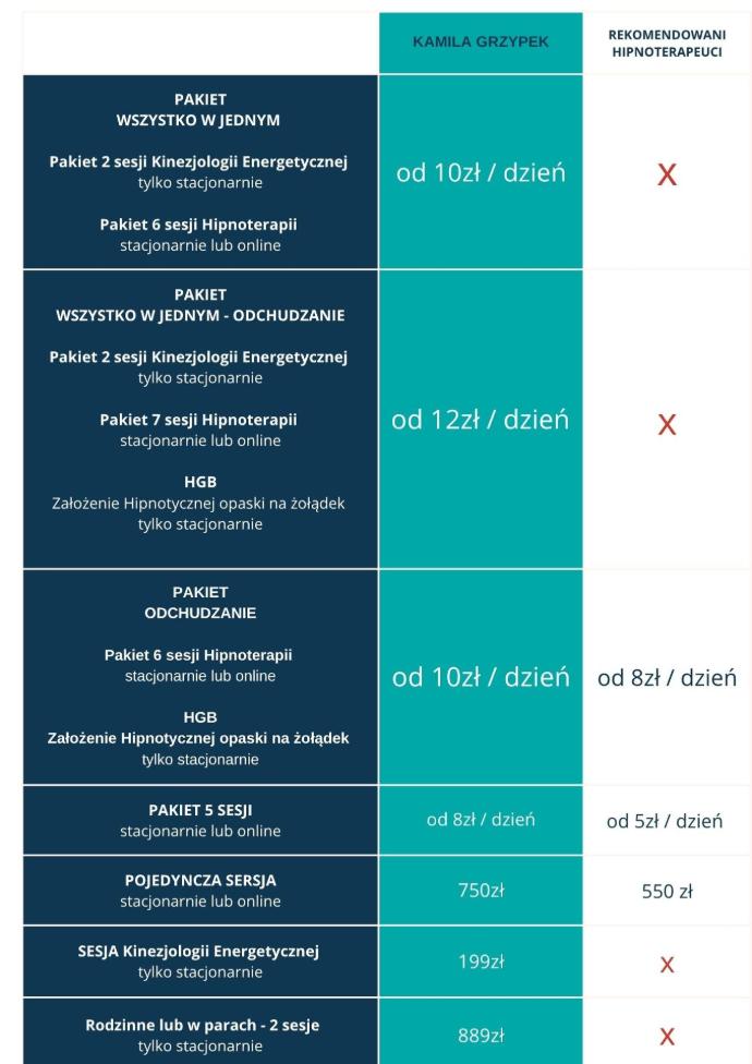 1. Wyboru osoby prowadzącej proces - możesz przejść swój proces hipnoterapeutyczny pod okiem Kamili Grzypek, hipnoterapeutki z wieloletnim doświadczeniem i bogatą wiedzą merytoryczną lub wybrać absolwenta Akademii Hipnodietetyki, który pracując pod moją koordynacją przeprowadzi Cię przez proces zmiany.